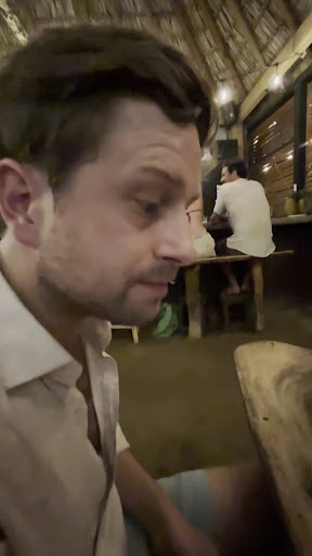 Inside, fairy light and what reminds me of a Mexican Octoberfest tent with wooden tables and mud on the floor.