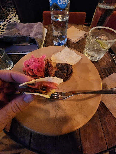 Read moreThis place is already well reviewed and our experience was great.cocktails were very good. I'm sorry I forgot exactly what I had, but I believe it was with pineapple mezcal and worms on top. The other with watermelon. We had the suckling pig tacos with chicharon. Fantastic with the guacamole pickled onions and with the house salsa. The regular tacos we got next we're not our favorite as the cheese made them a bit too salty for us and in comparison we preferred the pig tacos. Dessert sampler was also great. I wish it were served with a little bowl of honey as the honey was so good. The place is small so it looks like they extended tables into hallways beyond the restaurant near the bathroom and kitchen. That's where we found ourselves. It was still fine and the meal was still enjoyable. I would give 5stars for eating in the restaurant proper for atmosphere and three for the hallway. However the hall area was quiet and peaceful and still nicely decorated. I'm sure some would even prefer sitting in this area. Wait staff were pleasant and...