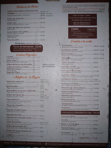 Un lugar totalmente familiar, Área de juegos para los pequeños Tranquilidad, excelente atención, no tardan para traer tus platillos, Con su rica y exquisita especialidad de su ( BARBACOA ) por taco o por kilo como gustes, variedad en sus platillos, en sus bebidas hay de todo desde un cafecito, un agua, refresco, (@) no faltaba su rico mezcal curado o normal. Les dejos dos fotos donde vienen sus precios y podrán comprobar que si es económico, comes super rico, dónde encuentras buen ambiente, buena atención, Esperando esta pequeña información les sirva para que más adelante puedan elegir un excelente lugar donde pasarla bien y degustar de buenos platillos. Nos vemos en las siguientes publicaciones.