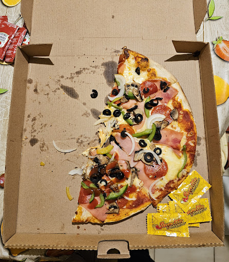 Llegué a unos minutos fuera del horario, aún así pregunté por el servicio, un trabajador al principio pensó que no pero al final me dijo que si solo para llevar en lo que los otros pedidos de Didi y Uber eats pasaban, no tardó más de 10 min una pizza de salami económica, la masa de la pizza es suave como industrializada pero el queso usado estaba en su punto, ni salado ni simple, el salami usado fue fresco y no estaba grasoso un poco más en el horno quedaría mejor, las salsas que usan están bien, la catsup es lo normal, la salsa picante se pasa un poco de ajo pero está bien si no se abusa de la misma, el lugar es agradable, tiene espacio como para 5 mesas de cuatro usuarios por el covid solo se pueden 4 sin estar tan juntas, fue una agradable primera visita espero prosperen y por la atención fuera del horario le doy...