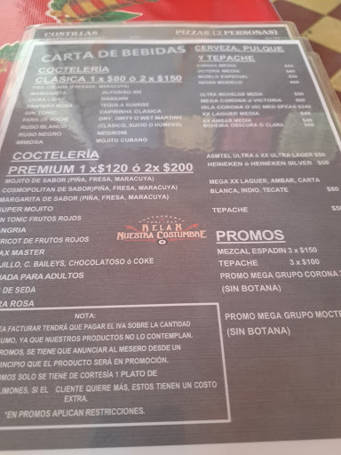 2 cervezas con bufet de botanas $200 2 cervezas Corona con bases de de limón y jugo Magui $ 116 ( masó, no recuerdo exactamente) 2 cervezas Corona $76 (masó no recuerdo si costaban 35 o 38 pesos)