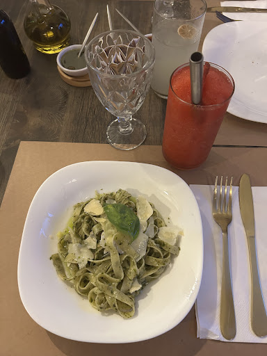 My GOODNESS this place was amazing! We came here after a whole day about learning about criminology and the human rights movement in Mexico, so I felt like I could eat a ton. The environment and decorations are so sophisticated, it genuinely felt unreal. I liked the wine bottles on the shelves that added a touch of posh (idk if that's a saying but I'm saying it anyways). We got out after nightfall and the lights they'd turned on were so pretty! The staff was super kind and funny, one lady helped point me out to the bathroom when she could clearly tell I was lost. She also made it funny when she had to duck underneath a staircase to take our order. I got the pesto pasta and a strawberry smoothie, both of which were SOOOOO good! My friend ordered a vegetarian pizza, which was also fire. But I think the best part was the molten lava cake for dessert, seriously the best dessert I personally had in Oaxaca. Definitely go here if you're looking for Italian (or just something good...