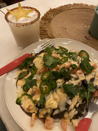 🥗 food - mixed feelings. We enjoyed our nachos starter and my boyfriend liked his pulpo and fish tacos. The pulpo taco comes with an integral piece of octopus (not cut up like in some other places). As a vegetarian I ordered some of the options without meat or fish although unfortunately the one I was really hoping to try wasn’t available (pastor made with sweet potato). I liked how they were creative but they lacked a little in execution. For example the peanut sauce in the vegan taco was super watery so it ran out of the taco and also made it very soggy. It was filled with carrot and then more shredded carrot on top. The avocado tempura taco also had tons of shredded carrot and just one piece of avocado. Unfortunately my partner found two hairs in his taco that were not his.