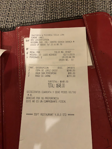 Read moreI am re- evaluating La Viega Lira. Originally went their old temporary site while they prepared the new / current site on Calzada de la Republica. What a fantastic difference. Food was good, wine selection was ample. I recommend the French Merlot. The service was on the spot and the back patio area gave you a front row seat to the aroma from the oven. Great place to enjoy a wine afternoon. Plenty of shade and a gentle breeze. I will be returning. The only caution I would give is that is a Cash Only restaurant. There is an atm at the mercado a block away. Hope you...