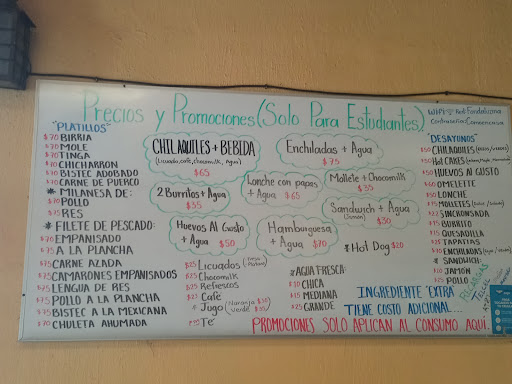 Read morePequeña pero bonita fonda ubicada frente al centro universitario de la ciénega, tiene convenio con dicha universidad y si tramitado la beca alimenticia puedes comer ahí gratis ciertos días. Tiene precios muy accesibles para todas las personas, peroo tienen precios especiales para estudiantes de la zona, además de paquetes. La comida es muy rica, ofrecen desayunos como Sándwiches, molletes dulces y salados, café, licuados, chocomilk, enchiladas, chilaquiles.... Entre otros También ofrecen platillos más fuertes para la hora de la comida. Camarones, milanesa de res y de pollo, pollo en mole, barbacoa, tacos... Entre otras cosas También hay agua fresca de varios tamaños y precios accesibles . El personal es muy amable, siempre te atienden con una sonrisa , y es muy rápido cuando te atienden. También hay baño gratis, internet, debes pedir la contraseña a las mesetas o meseros y con gusto te la darán También tienen una sección de dulces y botanas, como chocolates o Sabritas También ofrecen trabajo a estudiantes. Venden desde la mañana hasta tarde, aproximadamente hasta las 5 o 6 de la tarde. Esta sumamente recomendado ya que es muy rico todo y...
