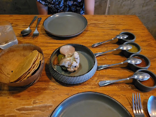 The food was horrible! The shrimp ceviche had raw shrimp that was not even cooked in lemon. Normally I like raw shrimp as a sushi, but not like this. The ceviche had no flavor but instead it tasted like sewer water! The bone marrow black bean dip has just a black bean paste, couldn't taste the bone marrow at all and we kept looking and turning over the mush and still couldn't find any bone marrow. Definitely bait and switch. Moving onto the tacos, they charged us $70 pesos each, total rip off. Each one was teeny tiny and all of them tasted like poor quality sewer water. The duck one was sooo dry that the duck meat was poking my mouth, the pork belly one was basically chewy pork rind that was over cooked. The steak one was so bad we took 1 bite and left the rest. The only eatable one was the sweetbread and that was over fried and burnt in the middle. All used chewy poor quality ingredients and had no flavor or nasty flavors.