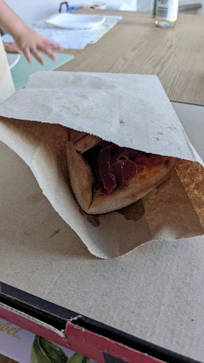 hm.. Pizza in a paperbag? burnt and with plastic? The service was nice and honestly kind, which can get really rare nowadays. BUT what we got for takeout is an impudence. They charge for the boxes (i'm fine with that) but i expect to get it in a box and not thrown in a paperbag. We couldn't eat one of the pizza because the plastic already painted off on the cheese. Others were burnt and between the Serrano was even plastic. You could tell the guy who was making the pizza was genuinely not happy that we ordered six small pizzas and a large one. Sadly that one person ruins it because of their mood and work ethic.
