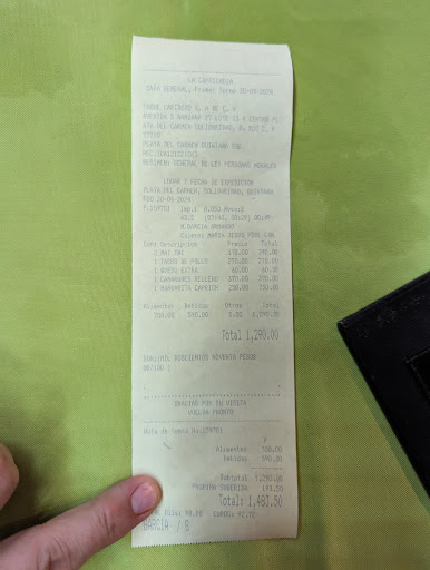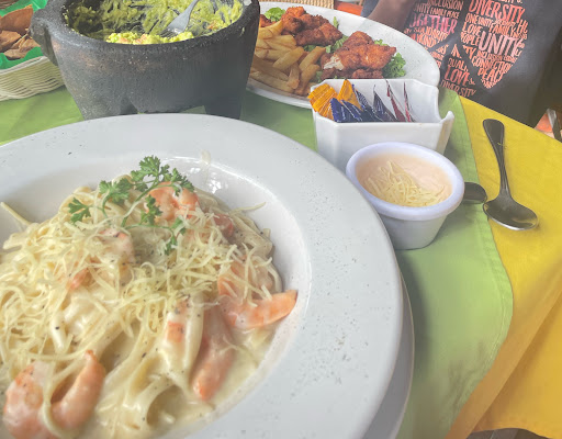 Food was bland but we we hungry, hot, and happy to have something. Staff seemed friendly, asking about our travel plans. I should have been more alert. A non-itemized bill was presented to me of 858 mxn for a kids meal, Shrimp Alfredo, and Guacamole. We had no drinks. We entered the restaurant with our own water bottles.