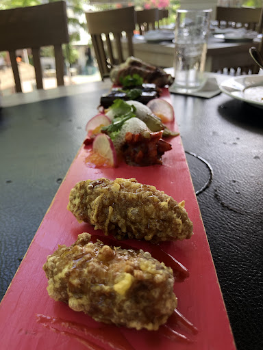 We started with a couple cervezas, had the house made guacamole with fried crickets as an appetizer and then we were blown away by our main courses. The Mayan Pork tacos and Soft Shelled Crab tacos. Wow, just wow! They were served along with a generous serving of different hot sauces ranging from rather mild (but with big flavor) to very hot (but still with amazing flavor).
