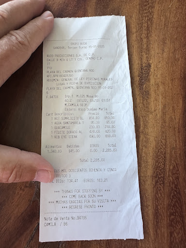 Read moreThe place is nice but my girlfriend ordered a grilled Dorade fish and got a Mahi Mahi fish instead. ( Which is much cheaper) . I got the Rib Eye beef but the quality was not good and contained a lot of fat. If you are there for Lunch you have to order for minimum 500 Pesos per person. In the afternoon it is 300 Pesos. Price is fine for a beach club. This is easy to spend. We went there twice. Yesterday in the afternoon for drinks. This was nice and music was moderate comparing to other beachclubs in Playa del Carmen. Today we went for lunch. And after the second street musician get the allowance from the beachclub to interfere with a very loud sound speaker it has ruined the relaxing atmoshphere so we decided to live like other guest did also. The management didn’t care much after we told the reason we left. Also no toilet paper in the ladies room. Attached the bill in...