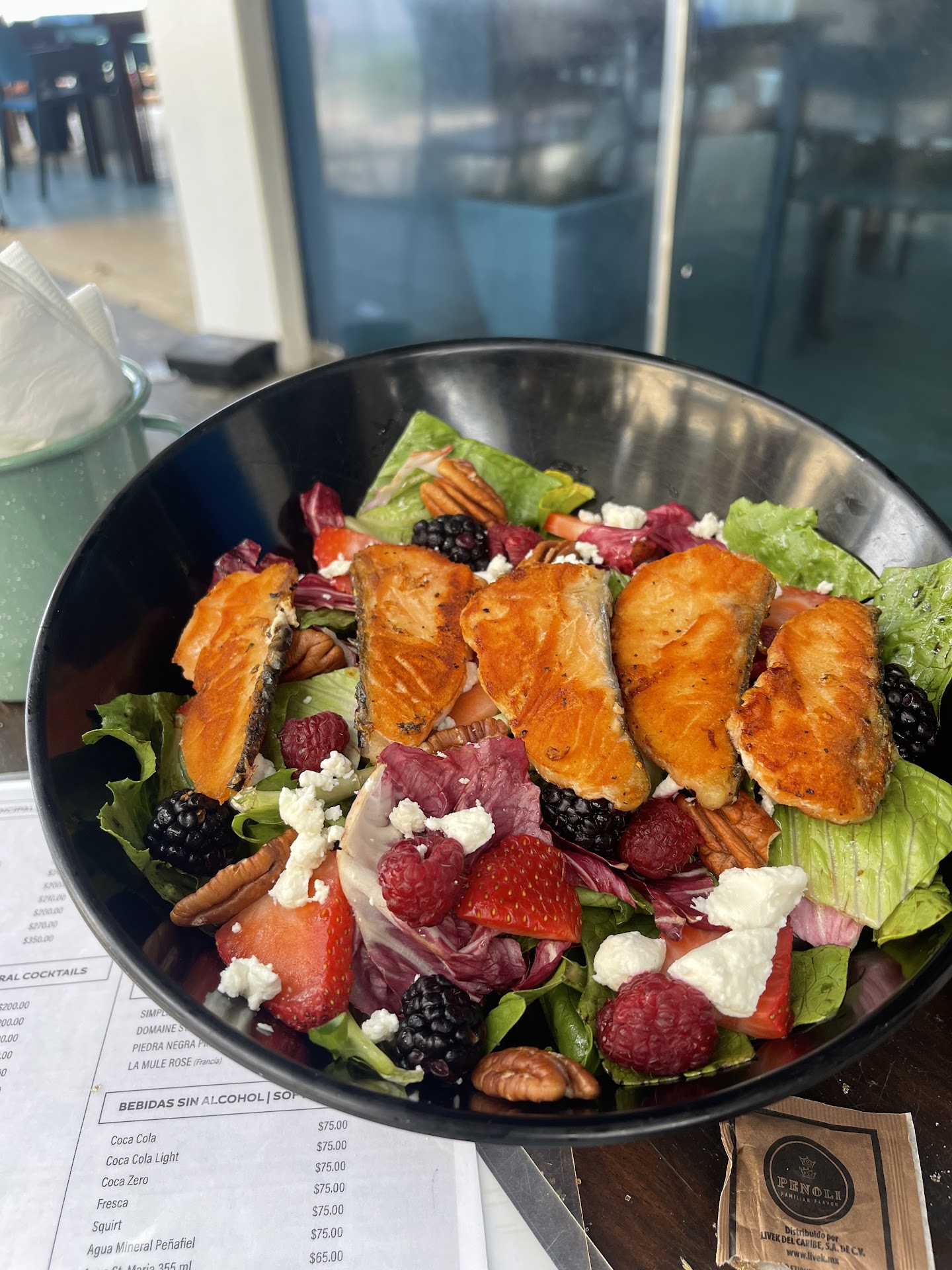 I asked her what her favorite salad was and she told me the salmon salad and so I ordered it. They did not include the dressing with the salmon salad and I had to go and ask for it. I wish I had never done that because once I tasted the salad after pouring the dressing on top of it, I came to realize that the strawberry vinaigrette was rotten and had a spoiled taste to it. Even the lettuce was wilted and not fresh.