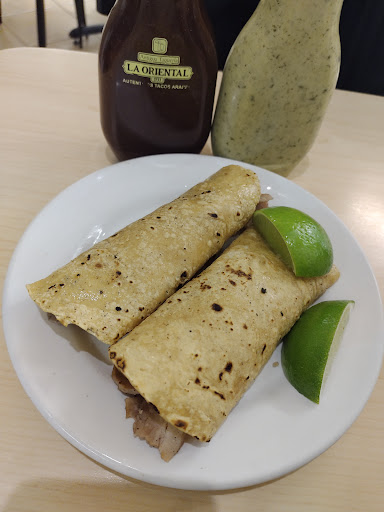 Read moreSucursal de la cadena de taquerías poblanas Antigua Taquería la Oriental, ubicada dentro de las instalaciones de Plaza América en la ciudad de Puebla de Zaragoza. Es un establecimiento tradicional poblano con múltiples sucursales en la ciudad. Conocidos por sus 'Tacos Árabes', los cuales son tacos de pan pita con carne de trompo estilo kebab. También manejan tacos orientales (tortilla de maíz), quesadillas, tortas y cemitas. Además de algunos extras únicos como jocoque seco y consomé de camarón. La carne en sí no tiene mucho sabor, por lo que la mejor forma de disfrutarla es en el pan pita del taco árabe. Esto porque en cualquier otra versión el sabor se verá opcado por el queso, la tortilla de maíz, el bolillo o cemita, etc. Tienen sus dos salsas tradicionales (verde y roja), que si bien no saben mal, no pican nada. En general es una experiencia que no vale la pena repetir constantemente. Es un gusto adquirido realmente, por ello no ves mucho su propuesta (aunque sea con otro nombre) fuera de...