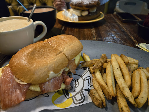 Read moreGood breakfast spot, we got sandwiches, one with bacon, eggs and cheese and another with hummus, bacon, egg and avocado, both were very good. You can choose fries or salad to be served with them and the salad was great, not just lettuce. The bread was mediocre, there is definitely a room for an upgrade. The drinks on the other hand should be improved - coffee is very average for a coffee shop and matcha was sweet without mentioning it on the menu😖 The service is good, overall the cafe left a...