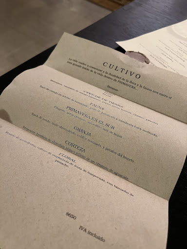 Read moreRestaurante ubicado en Puebla, con un concepto original y entusiasta. El lugar es como una casona antigua pero adaptado y restaurado como restaurante. Visitamos el lugar un sábado por la noche y ordenamos el menú degustación con un precio de 650 con IVA. No ofrecen maridaje, pero sí una carta de mixología y vino por copeo. En nuestra visita solamente tenían vino tinto. Me parece que no ofrecen menú a la carta. Basan el concepto de su menú en las temporadas del año y constantemente van renovando sus platillos de acuerdo a la disponibilidad de ingredientes donde predominan los locales. A total son 9 platillos diferentes, con una presentación excelente y sabor muy bueno en la mayoría. Los que más nos gustaron fueron definitivamente Fauna: taco de conejo, que va marinado y puré de zanahoria, simplemente riquísimo. Granja: cerdo con mole, la carne suave y en su punto, jugosa y con gran sazón. El sabor del mole muy agradable. Acompañamos con una copa de tinto y fue de mis experiencias favoritas de la noche. El resto de los platillos ricos, pero estos dos son definitivamente los que se llevan el menú. Mención especial a Primavera en el sur, delicadamente rico. Como puntos que no nos agradaron fueron que algunos de los platillos tenían temperaturas que podían mejorar (algunos más fríos que se esperarían calientes), pero nada que fuera desagradable. Sugeriría que ofrecieran algún tipo de maridaje porque los platillos son sumamente creativos y creo que se prestan para complementar con bebidas pensadas en los platillos. Las bebidas estaban muy buenas, también creativas en cuanto a sus ingredientes y sabores muy balanceados, no tan dulces. El servicio fue muy bueno y conforme te llevan los Platillos te explican un poco más aunque creo que los comentarios pueden ofrecer un poco Más de visibilidad a la historia detrás de los platillos. En general, sí recomiendo este restaurante, es una de las experiencias culinarias más interesantes que he probado en Puebla y sí volvería en otra temporada a probar los...