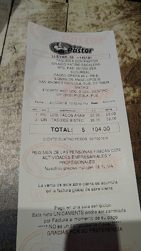 Read moreLa verdad las primeras veces estaban buenos los tacos ya llevo un año probándolos pero últimamente me han sabido los de pastor muy salados la lengua me la escala y los tacos de bistec para llevar si los piden así los dan bien caciques no se vale pero por último no sé si el pastor pues a veces tienen uno que acaban de hacer pero lo emplayan con hule sin embargo, afuera del refrigerador y está mal porque los microorganismos crecen a temperatura ambiente que mal. No creo que vuelva a comprar debido a las malas...