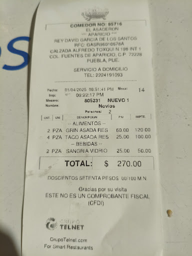 Un lugar con mesas en área techada y mesas al aire libre, me gustó más la carne asada que la arrachera, en la compra del kilo de carne incluyen refresco de 2 litros, tortillas de harina y de maiz, cebolla, guacamole, cilantro, limones, 4 tipos de salsas, rábanos nopal y 2 cebollitas asadas. El paquete está a un precio conveniente para una familia de 4 o 5 personas, pues por cada una se gasta aproximadamente $75 u $85 si sólo se consume el paquete de kilo de carne, sin extras. La atención de la mesera no...
