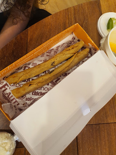 Read moreSolo he ido en una ocasion, el lugar me parece que está bien ubicado, la plaza tiene un estacionamiento lo suficientemente amplio para no tener problemas. El ambiente de esta sucursal es tranquilo al menos el día que fui, las instalaciones son aceptables, teníamos una mesa que se tambaleaba un poco y amablemente nos la arreglaron, éramos cinco personas y no hubo problema en juntar dos mesas, el trato del personal fue muy bueno. La comida excelente, honestamente creí que no quedaría satisfecho solo con cuatro flautas pero son de buen tamaño y realmente tres son más que suficientes para quedar satisfecho, tienen una buena variedad de combinaciones que puedes probar, además de contar con otros platillos los cuales en esta ocasión no pedí pero en el futuro probablemente pruebe algo...