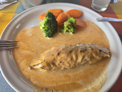 Pedí spaguetti italiano y la pasta estaba ligeramente dura y sin sabor. El platillo fuerte fue pechuga rellena, así decía la carta sin embargo al servirlo traía una salsa de aderezo de chipotle, considero que eso también se debería mencionar en la carta, porque no ha todas las personas les gusta o la conocen de manera típica sin el aderezo. Y para terminar las verduras estaban duras.
