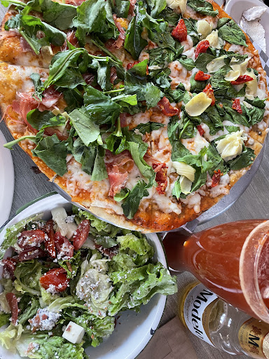 Pizza: We got the pesto, and it was pretty unfortunate. The pesto itself is excessively greasy, and has no fresh basil flavor, it is brownish grey. Are they using dry basil? It is a really poor pesto. The nuts were nice, but a bit heavy, I'd reduce them by half. Cherry tomatoes are a good idea because they're still sweet out of season, but they need more time in the oven. The crust is woefully undercooked and soggy. A thin pub style pizza crust needs to support the toppings, it shouldn't flop like a New York slice. You need higher protein flour, and you need to work the dough a LOT more. I cannot believe that the pizza has good reviews here, because this is a truly bad crust that needs a total rework, as does the pesto.