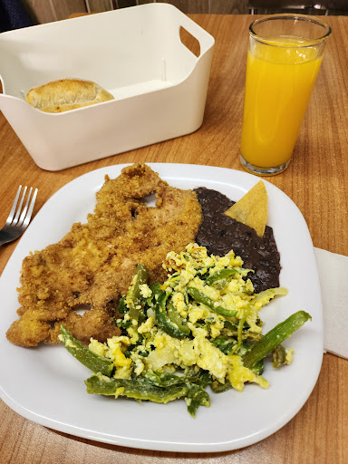 Un poco decepcionante la experiencia Vi el restaurante en maps y fui, el lugar es muy limpio y agradable, los precios me parecieron acorde a lo consumido, no es barato pero para nada es caro pedí un menú de desayuno de 100 qué incluía jugo, plato de fruta, algún platillo de su lista(yo elegí milanesa de res con frijoles y rajas con huevo), café y un pan, la comida estuvo muy bien a excepción de la milanesa en la que sentí un poco quemado el aceite donde la hicieron y el peor punto fue la atención, a pesar de que había muy poca gente el mesero estaba apurado en tomarme la orden y no alcance a pedirle algunos detalles, por ejemplo para el plato de fruta le pedí que no llevara papaya, después quería preguntarle si podía cambiar la opción de café por algún té o un vaso de agua, pero solo me preguntó por el café y en cuanto dije no me respondió que estaba bien y se fue. Su forma no fue mala, pero me quedé disgustado por no ajustar mi platillo a poder cubrir mi gasto, cuando me llegó la fruta parecía que solo retiraron la papaya sin rellenar su parte faltaste y de tomar solo me dieron el jugo(qué no me gustó porque sabía a una mezcla entre jugo natural y artificial). En resumidas cuentas es un lugar muy agradable y limpio, pero tal vez deberías de pensar bien que ordenar, más si vas a retirar algo...