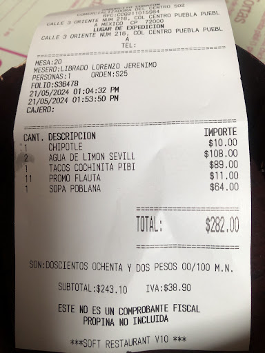 El servicio fue demasiado lento para lo que fue… salieron primero los tacos de cochinita pibil, que la sopa poblana recalentada por décima vez.