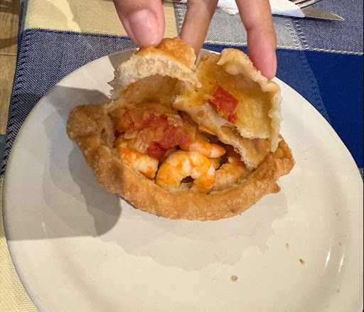 La comida puf! Muy rica y muy bien servida, de inicio el pan de cortesía y los totopos junto con la salsita es delicioso…lo que probamos: camarones al mojo de ajo, pulpo a la mantequilla, caldo de mariscos, cóctel de camarones, camarones empanizados y una mojarra estuvieron súper bien servidos. Como postre el plátano frito estuvo delicioso, acompañado de una bola de nieve y lechera hizo que la comida terminara muy bien. El café cargado y muy rico, el cheescake no nos encantó. En general muy recomendable la comida!
