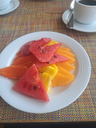 Read moreÓrden: huevos motuleños, bisquet california, jugo de naranja, jugo de naranja con papaya, café, té, muffins. Para empezar el lugar es muy limpio, ubicado en una plasita agradable en la que si no me equivoco es el único lugar que hay para comer. Tiene una terraza de buen tamaño, bien sombreada. La atención es muy amable y atenta. Te hacen sentir consentido. La carta es suficiente y todo parece muy rico. Respecto a nuestra órden, así fué. Los motuleños muy ricos, los plátanos con los que se acompaña a ese platillo exquisitos, no sé cómo los preparen pero les sentí un ligero sabor a canela y algo dulce, talvez el mismo dulce del plátano o quizá maple. El bisquet muy rico aunque creo que podrían dejarlo un poquito más en la plancha para que se sienta un poquiiiito más dorado pero no importa, está muy rico. Los jugos pues en ésta época del año el país goza del privilegio de fruta deliciosa y así estuvieron los jugos, muy ricos aunque creo que sería agradable que fuera una cantidad algo mayor. El café es bueno, suave pero con sabor agradable, bien calientito y el muffin en esta ocasión fué de avena, muy sabrosón. No tengo más que decir que fué una agradable visita, quedamos satisfechos, incluso diría llenos. El precio me parece acorde a todo el servicio. Lo recomiendo... Por cierto, ya saben, fuimos con mi perrito, o sea, pueden ir con el suyo y pedirle unos ricos huevitos...