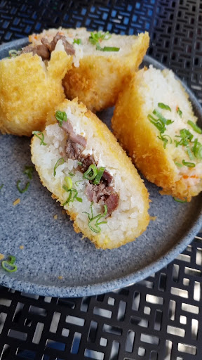 🎋 De entrada elegimos onigiri 🍙 bomb uno de tampico y otro de arrachera 🥩 con queso 🧀 crema acompañados con salsa 🌶 chipotle.