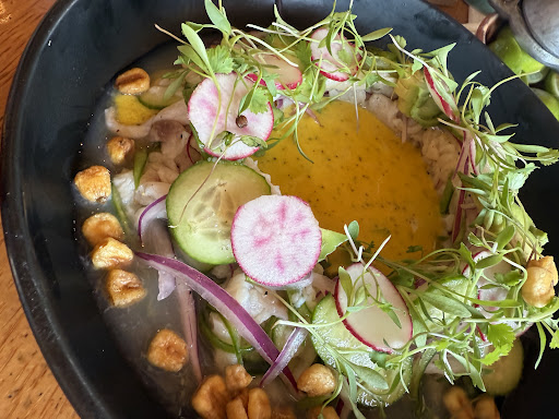 Probamos las Tiritas de Pescado, el Caldo de Camarón con Xoconostle, la Tostada de Pulpo Enamorado y el Taco Gober, todos con sabores muy bien equilibrados y una presentación impecable. El caldo en particular, con ese toque de xoconostle, fue una grata sorpresa por su profundidad y originalidad, así como las Tiriritas de Pescado, con su leche de tigre de maracuyá.