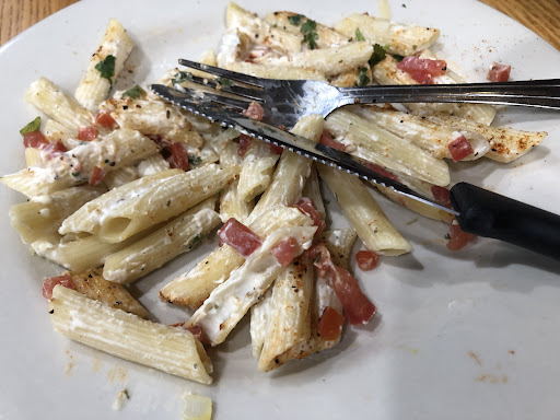 ¿Lo peor de todo? Desafortunadamente la comida… La carne de la hamburguesa aún roja por dentro siendo que, por estándar del restaurante, la carne de las hamburguesas debería salir a término completo. Hamburguesa sin sabor, sin chiste y con lechuga pozolera (rallada). Ni siquiera las papas estaban rescatables; estaban frías y chiclosas. No nos las comimos y eso que realmente amamos las papas a la francesa. La pasta de verdad debería darles vergüenza vender eso. Parece que agarraron un bote de crema “alpura” del refrigerador y así, tal cual, se la vaciaron a la pasta, le picaron jitomate encima y voilá! Que se la coman los clientes, ¡total!