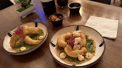Frente a mí, llegaron los tacos de camarón y pescado capeados, y en ese instante, entendí que la cocina también puede ser poesía. El rebozado, dorado como la última luz del atardecer, crujía al contacto como un secreto bien guardado. Debajo, un lienzo de guacamole sedoso se extendía sobre la tortilla como un susurro verde de frescura. Sobre todo ello, una lluvia delicada de ajonjolí negro y blanco. Y para coronar la obra, cebolla encurtida que parecía haber sido pintada con pinceladas de magenta y memoria.