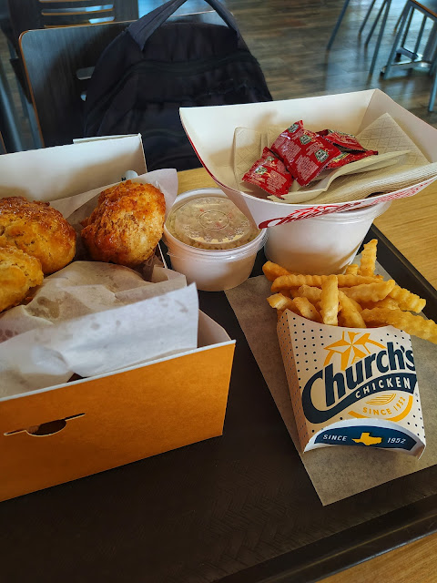 Read moreThis was an exercise in revisiting a taste of my way past youth. In Vancouver, Church's was next to my church, and the place to sneak out of service to discover the other "sinners". Gloria's dad? And smoking cigarettes!? In my later youth, as a homeless person, I was allowed to stay, along with Wind and Willow, in the basement of an eastern, vegetarian cult. One day, I managed to come into a couple of bucks (dollars in case the vernacular eludes you) and rushed down the hill to gorge on Church's greasy goodness, resulting in my expulsion from said cult's domicile! And so, with many memories, I entered my first Church's in many a decade. Where do they get such meatless chickens? Are they selling the meat then breading the bones? Two stars? One for cleanliness, and two for the same old greasy good batter that made...