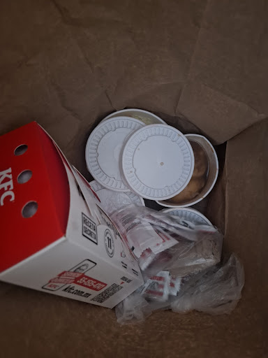 Cuando voy a mitad de camino, hacia mi casa me doy cuenta que el pollo tiene un olor muy raro, pues yo pedí pollo normal, sin ningún tipo de salsa. Cuando llego a la casa me doy cuenta que me dieron el pollo incorrecto y en vez me dieron un pollo con una salsa muy fea, que ni se que era pero wow, fue todo un asco tuve que tirar el pollo a la basura y gracias a ese pollo, nunca voy a regresar a KFC de nuevo.