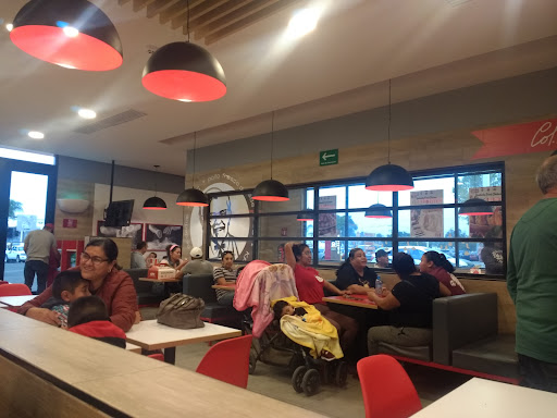 Llegamos al rededor de la 1:30pm de un viernes, el restaurante estaba al rededor de 1/3 de su capacidad, había sólo unas 5 personas frente a nosotros en la fila para ordenar. Al ordenar se les tubo que repetir en varias ocasiones lo que deseábamos ordenar a la cajera (puede haber sido la música o simplemente no estaba poniendo atención), añadido a esto intentamos pedir algo que se mostraba en el menú pero ella insistió que esa opción no se podia ordenar. Despues de un tiempo esperado (buen tiempo promedio, unos 5 min) nos llamaron para recoger nuestra orden, sólo nos entregaron la caja con lo ordenado, no nos ofrecieron platos, cubiertos, servilletas… Al regresar a pedirlas tuvimos que esperar otros 3 min en otra fila donde otros estaban esperando por artículos similares.