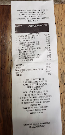 Read moreEl pedir las cosas en el Drive Thru de esa sucursal ha sido la peor decisión de hoy. Para empezar solo aceptan pago en efectivo, no tenían la hamburguesa hot&spicy ni ketiras bbq. Elegimos La Megabox con Big Krunch pues a palabras de la que atendió, era la única hamburguesa disponible. Lo peor llegó al llegar a casa y abrir el paquete: La hamburguesa no tenía lechuga, las papas venían en muy baja cantidad, la Ketira medía la mitad de lo que deben medir en ancho y largo y "OLVIDARON" poner ambas ensaladas. Nunca fuimos advertidos de nada de eso. Adjunto fotos de uno de los paquetes recién abiertos y del ticket. No volveremos a ir a esa sucursal ni a probar KFC a...