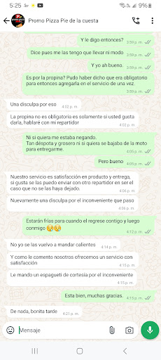 Pésimo servicio, en calidad y atención al cliente. Hice mi pedido 3:06pm Dijeron que llegarían en una hora y si fue así, pero como pueden ver el repartidor además de ser un déspota, grosero y sin ganas de trabajar, no quiso realizar el cobro porque no se agrego propina en el cobro por tarjeta. reporte claro, dijeron que iban a mandar spaguetti como cortesía y la pizza caliente, (imagine que no tardarian si solo reenviarian) por el mal momento y además de que no mandaron nada, demoraron más de 40 minutos, pensé que habían hecho la pizza nuevamente pero al parecer solo recalentaron, ingredientes baratos, el sabor no es agradable. No puedo creerlo, ya había pedido antes y todo había estado bien. Deberían revisar su personal y mejorar su servicio, que de verdad ha sido PÉSIMO. Y por $299 hay mejores opciones. (No es el dinero, es una decepción) No...