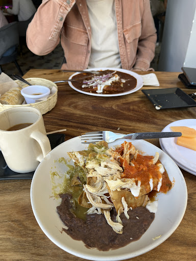 El personal amable, el café cumplidor. Pedimos un croissant de canela relleno de cajeta que estaba delicioso. Yo pedí huevos divorciados y mi novio, Enchiladas queretanas. Los huevos estaban montados sobre tostadas, que estaban muy grasosas y duras, como viejas. Los huevos y salsas bien. Las Enchiladas de mi novio estaban súper resecas, solamente las probó y las dejó. Además las papas estaban recocidas y vueltas a cocer hasta dejarlas negras (pero otras estaban bien, como que mezclaron de 2 tipos).