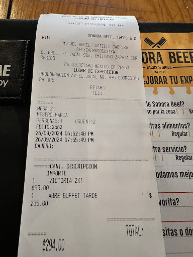 Read moreHoy, jueves 26 de septiembre de 2024, tuve una experiencia muy decepcionante en Sonora Beef. Llegué a las 6:56 PM y pregunté específicamente si aún alcanzaba el buffet de $199, ya que este precio es válido hasta las 7:00 PM. La mesera me aseguró que no había problema, que todavía aplicaba el precio de $199.