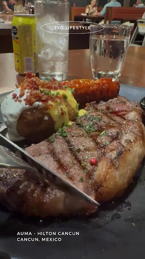 I had an excellent dinner at AUMA, the signature grill at Hilton Cancun All-Inclusive. From the ambiance to the food, everything was top-notch. Here’s what we ordered: • Grilled Bread – A nice touch for the table, warm and delicious. • Provoleta Asada – Charred provolone with roasted peppers, chimichurri, and toasted baguette. Make sure to eat it fast—the cheese hardens quickly. • Carpaccio de Res – Thinly sliced beef tenderloin with lemon aioli, capers, pickled shallot, arugula, and shaved bread. Light, flavorful, and well-balanced. • Ensalada Caesar – Romaine, parmesan, roasted garlic dressing, and toasted croutons. Came in a very unusual plate, but the taste was excellent. • Shrimp Cocktail – Fresh, well-seasoned, and a great starter. • New York Strip (300g / 10.6 oz) – Cooked to perfect medium rare. This was my favorite dish of the night—tender, juicy, and full of flavor. • Steak de Coliflor – Cauliflower steak with warm eggplant caponata, charred carrot purée, herbed breadcrumbs, and arugula. A great vegetarian option with bold flavors.
