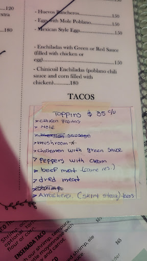 Front menu suggests tacos at chinicuil is 35each. Inside menu doesn't say the individual prices of the tacos. We ended up getting billed almost twice the suggested cost. Was suggested two tacos. Received two different and was told they were the wrong tacos. Waiter acknowledged they made a mistake and we received our original suggested order. However, we ended up getting charged for the mistakes made by their team.