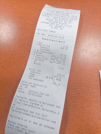 Read moreEstá experiencia me pasó hace un mes. Si dejas propina te tratan bien. Por error llegamos al aeropuerto de Cancún, somos de Tulum, teníamos hambre y comimos y el chico me dice gusta agregar propina? Y le digo propina de qué? Solo estás tomando la orden ! Y ví su cara de enojo por no dejarle propina y de malas realizó su trabajo. Pedimos amablemente platos y salsas y dijo que todavía no llegaban. Llegó otra familia y como dejaron propina y a ellos si les dieron platos y salsas. Es injusto que estás personas pidan propina, SOLO SON TOMA PEDIDOS, ELLOS NO HACEN LA COMIDA O TE LA SIRVEN O TE...