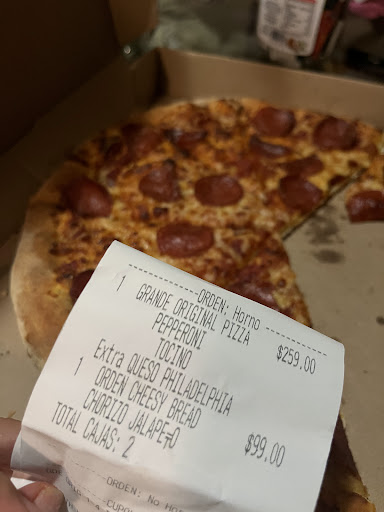 Read moreSiempre mi pizza llega fría y está a 2.3 km , siempre les doy propina y de más a los repartidores y no es justo que lleguen siempre 2:30 hrs después casi 3 horas con el servicio. Aveces llamo y pido hablar con el encargado y quien me contesta es el repartidor. Y no sé si eso lo sepan los altos mandos o gerentes pero está sucediendo que están mandando una miserias de pizzas , la masa cruda, sin tomate y poco queso. Deberían de reportarlo a salubridad o protección civil que vayan y les pongan sellos d cancelación por que ña gente paga por un buen servicio y comida y no son dignos de cumplir las políticas que ellos aplican según cuando les conviene . Y llegan y quieren que les des propina. Es necesario que les pongan unas buenas multas o lo...