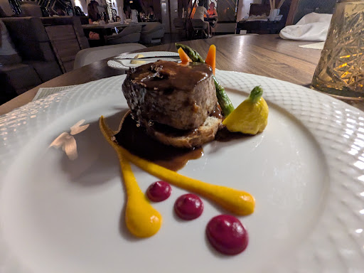Ambiance The restaurant boasted the most romantic setting of all the places we visited, with dim lighting and luxurious, plush seating creating an intimate atmosphere. It was an ideal backdrop for a memorable evening. The only drawback was the absence of an in-restaurant washroom, requiring a brief excursion outside...