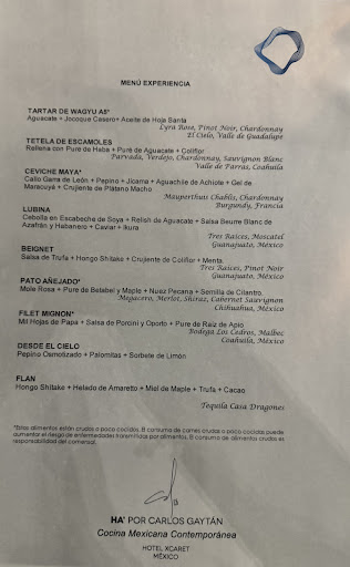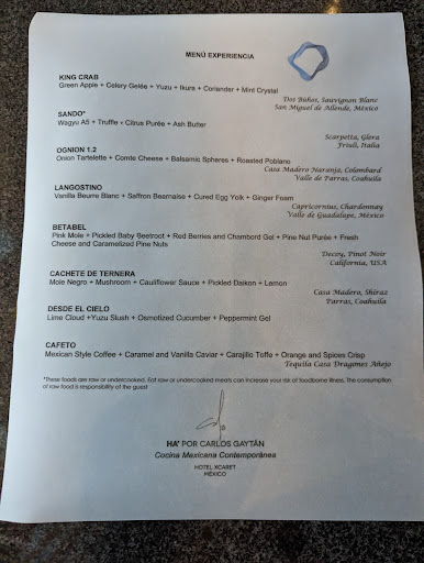 Read moreFood, service, and ambience was definitely a 5 star experience. Varied and seasonal tastes using local ingredients and french techniques. The amuse bouche at the beginning of the meal were surprising and exciting. Main courses were excellent. Alcohol pairing was hit and miss. The Mexican and Californian wines were a bit underwhelming. The tequila and Italian wine were excellent. I felt that the more Mexican inspired dishes were the stronger ones, the more French dishes were good, but not quite to the same elevated level. I think that a more varied alcohol pairing featuring wine, beer, and cocktails would better suit the Mexican theme of the menu. An on-site sommelier would probably be able to pair the food and drink better. The final chef's gift bon bons were very good, the truffle flavored chocolate truffle was legitimately one of the best bites I've had in a while.