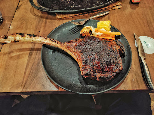 we started with 3 hot entrees, the calamari, the razor clams and the bone marrow, all perfectly sized and delicious. for the main course we decided to go for the biggest and baddest item on the menu, the mighty 35oz Tomahawk steak, we asked for medium well, it came more on the medium side, but rest easy. the plate was hot enough for us to be able to perfectly cook the strips as we pleased.