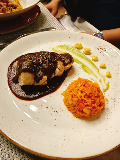For our son, we ordered the chicken alphabet soup, but it was far too salty and had to be returned. Thankfully, the kids’ quesadilla and fries were excellent — he really enjoyed that meal. We also ordered the chicken mole tacos, which were delicious and perfectly seasoned. The chicken mole entrée had good flavor as well, though it came with some leftover herb stems that could have been cleaned off. The fish entrée was tasty but had a few scales remaining, which was disappointing.