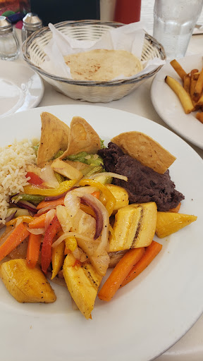 Fajitas get a 5/10. Half the serving of veggies was actually over grilled plantain. I thought, hmmm, that is interesting and I was excited to try the combo of veggies, plantain and even pineappple... but the plantain was simply a mushy addition to my fajitas. I left all of it off to the side. Husband pulled out 7 very thin strips of peppers hoping they were not as overcooked as the zucchini and carrots... they were. The guac, rice and the beans were great. And the 2 tortilla chips that came as "garnish" were light and crispy.