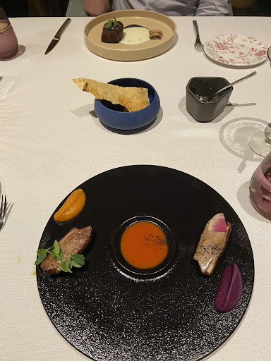 We started with some burrata which came with an eggplant purée. It was refreshing and a great start to our meal. We then tried soft shell crab tacos, which we ended up ordering seconds of and two tostados: sea scallops + beef carpaccio. Sooo delicious. For our main course, we had the duck and filet mignon - both of which were incredible cuts of meat with perfectly paired sides of sweet potatoes, mashed potatoes, bordelaise sauce and mushrooms. The chocolate hazelnut dessert was probably the best dessert I’ve ever had. Wish I was in Mexico to visit here more often tbh. Thank you to the staff for making this an unforgettable dining experience...