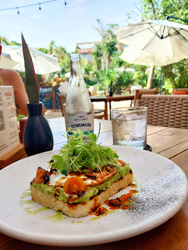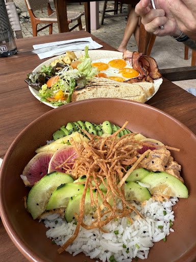 If you’re looking for a brunch spot that blends delicious drinks, a stunning atmosphere, and a vibrant social scene, this is the place to be. The open-air setting, shaded by woven canopies and surrounded by lush greenery, creates a relaxed yet stylish ambiance. The wooden furniture and natural decor add to the laid-back tropical charm, while well-crafted cocktails—like an Aperol spritz and a mojito—make for the perfect midday indulgence.