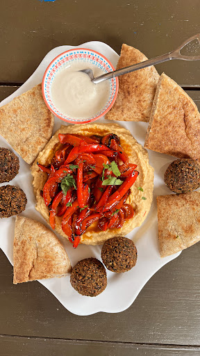 The portion was quite small. I ended up eating extra bread from my friend's basket and still left feeling hungry. The chicken skewers were a bit dry and lacked flavor, and the sides were minimal—just a small serving of rice, a grilled Roma tomato, two pieces of red pepper, and a tablespoon of hummus. 1 small garlic sauce and something pickled. Considering the price, I expected a bit more, even for Tulum.